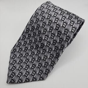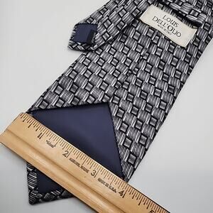 This is a gray geometric patterned silk tie designed by Louis Dell 'Olio. It is a designer tie made in Italy with a classic length and width. The tie is in like-new condition and is suitable for men's accessories or clothing.