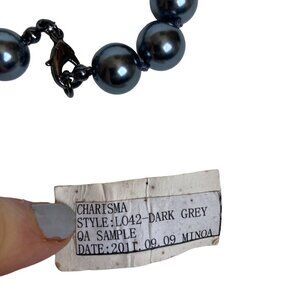 1) Long strand of gray pearls. Knotted. Gunmetal-tone lobster clasp. 72". Weighs 10 ounces.