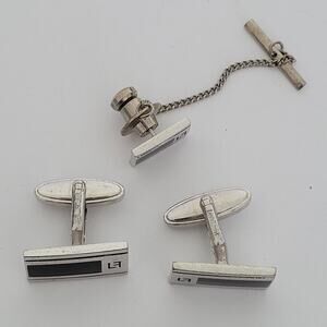 Louis Feraud LF Tie Pin Clip Cufflinks Set Silver Black Tone Designer Rectangle