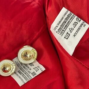 The jacket features a pique fire red fabric with a one button front closure with logo on, and a relaxed construction.