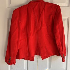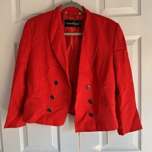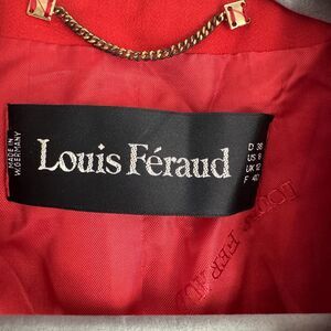 Step into timeless elegance with this vintage Louis Feraud double-breasted short jacket in size 8. Crafted from a luxurious wool and viscose blend, this vibrant red jacket exudes sophistication. Featuring bold black and gold buttons, it offers a striking contrast that enhances the jacket's structured silhouette. This piece is a rare find, made in West Germany prior to reunification, showcasing impeccable craftsmanship and quality.