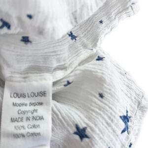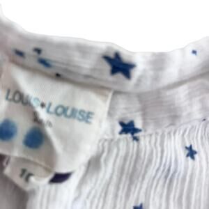 Louis Louise white muslin blue scattered star print shirt. Five-button placket. No cuffs on the sleeve. Excellent condition. High fashion piece. Great summer, cruise, and vacation piece.
