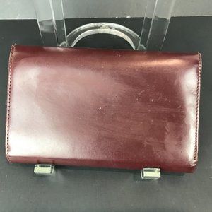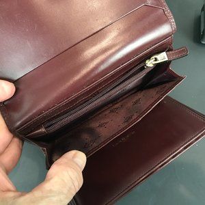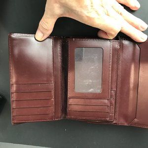 This Louis Quatorze wallet is a great addition to your accessories collection. The burgundy leather wallet has a tri-fold design with a button closure and features the brand's logo. It is perfect for keeping your credit cards and cash organized with multiple card slots and a bill compartment. The leather material gives it a classic and sophisticated look, while the accents add a touch of elegance. This wallet is a must-have for any fashion-conscious woman. This wallet is in very good condition. There are some marks visible only in some lighting. Please refer to pictures. 6" x 4"