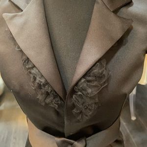 Louis Verdad black satin top with lace frills on lapels and belt. Dress up or down with jeans or a skirt. Purchased at Neiman Marcus