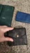 1. Green Tiaga Brazza Style Wallet: Exterior Leather bunching as pictured, interior discoloration, six card slots, two bill pockets and checkbook pocket. Peeling in bill area.