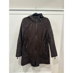 Brown monogram on one side and solid black on the other side. Silver buckle.