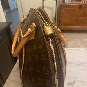 the shape is like a bowling bag it has leather handles it comes with the key and lock not used that much at all excellent condition