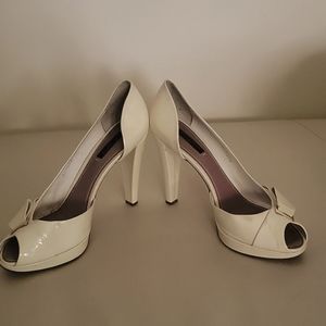 Vintage Cream Glossy Patent Calf Leather 4.25" peep Toes elegant pump 40's era ~