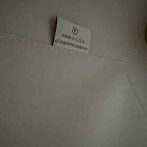 Real leather changes discolored a little. Not too bad, noticable, please look at photos. It’s off cream color throughout the leather but there are no rips. No scuff marks in side. No stains, no smell, gold is immaculate. Handles are great.