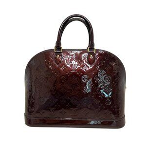 Louis Vuitton Alma bag. Dark burgundy monogram patent leather. Double rolled handles. Gold zipper closure.