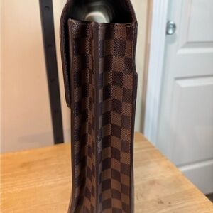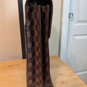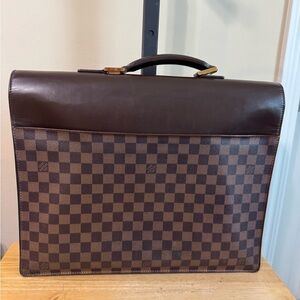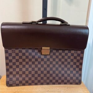 The Louis Vuitton Brown Damier Briefcase combines the iconic checkered pattern with rich brown leather trim, offering a sophisticated and professional look. This structured, rectangular briefcase is perfect for business settings. Date Code: RI0031; Size: 11x16x4;