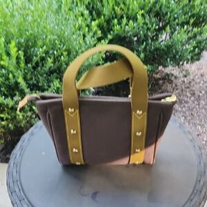 mini bag in rich brown. Gold tone accents. Features elegant gold accents. Perfect for any outfit.