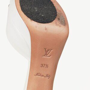 The Apple pumps from Louis Vuitton's fruit-themed 2009 Spring and Summer shoe collection are crafted in a white patent leather, and feature covered cone heels with logo embossing, almond peep toes, bow-detail straps with gold-tone buckles mimicking the peeling of an apple, D'orsay cutouts, low platforms, and leather lining and soles.