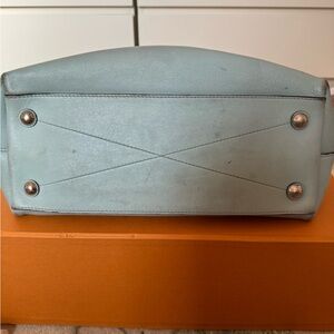 This is a gorgeous and rare Louis Vuitton Articles de Voyage Cabas Tote in supple pale blue leather with perforated LV Champs-Élysées logo detail on the front. It features a comfortable braided brown leather handle, silver hardware, and a spacious suede-lined interior with zip pocket.