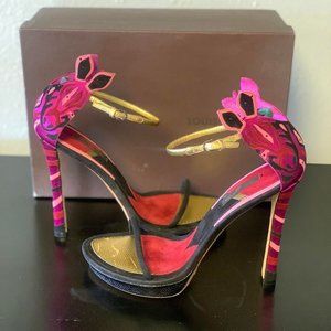 This Authentic Louis Vuitton Artifice Ankle Strap sandal in mix patchwork is another very intriguing piece and extremely stylish. This one’s heels is a zebra motif covered in satin. It comes in fuchsia and originally costs $1540.