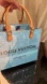 Artistic Louis Vuitton tote with blue and tan design. Features bold logo and sturdy tan handles. Ideal for a chic look.