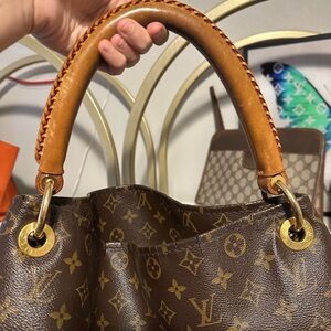 Callouts: cracking around top (very common on this style bag) staining on interior, minor markings on bottom exterior