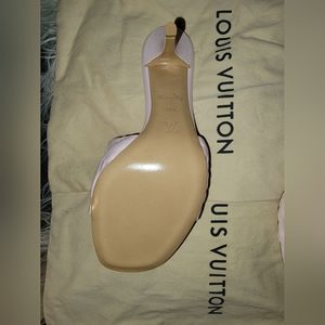 These stylish baby pink mid heeled mule sandals are monogram embossed and they feature a 2.25-inch heel.