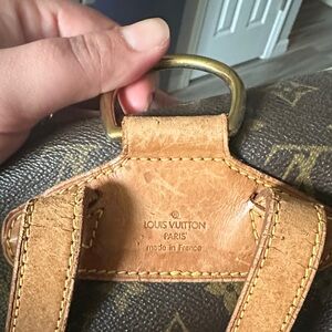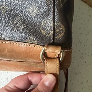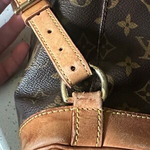 Please look at pictures. There is cracking. On the leather around the bag opening. The buckle on the flap has some spots and signs of cracking. There are definitely signs of wear. The draw string is not the original. It is from a refurbished Louis Vuitton bag. It’s a great bag.