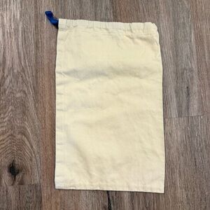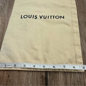 Beige drawstring bag with iconic Louis Vuitton logo. Ideal for accessory storage.