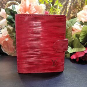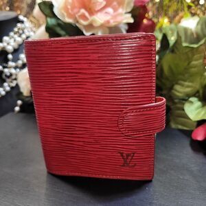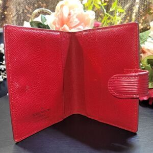 Authentic Louis Vuitton Bifold Wallet Red Epi. Peeling inside the card slots as seen in photos. There is very minor signs of wear on the edges. Snap closure works perfectly. This is a great little addition to your LV Collection. The wallet comes with a dust bag as well.It's gorgeous and priced to sell. Please review all pictures.