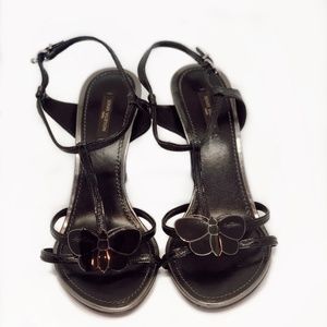 Like new! Elegant Louis Vuitton black with grey touches wedge. Embossed butterfly and adjustable ankle strap! Plus a very comfortable cushioned foot-bed.