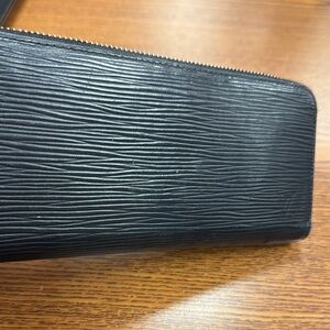 Elegant LV black Epi Leather zip wallet with silver hardware. Secure zip closure. Outside minimal wear-one corner as seen in photo 5. Inside is immaculate. Missing outer zipper pull, which is originally a leather pull, but still has the circle to attach it. Tiny corner rubbing