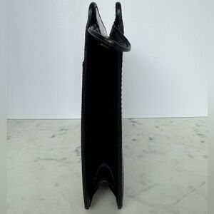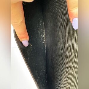 Vintage Louis Vuitton zip clutch in black Epi leather. This structured piece features a classic LV embossed logo, gold-toned zipper with LV branding, and a slim silhouette ideal for carrying essentials. Outer leather shows minor surface wear; interior pockets both have visible signs of peeling and wear (see close-ups). Zipper functions well with some tarnish on the pull. Perfect as a grab-and-go vintage clutch or organizer in a larger tote.