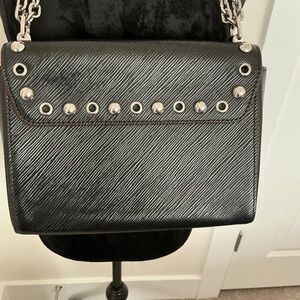 Preowned in very good condition. Suede inside. Mirror in inside pocket. Silver chain strap and studs front and back. Some studs have LV marked on them.