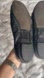 Chic black leather flats with embossed design. Features gold bow accents. Ideal for stylish comfort. As is.