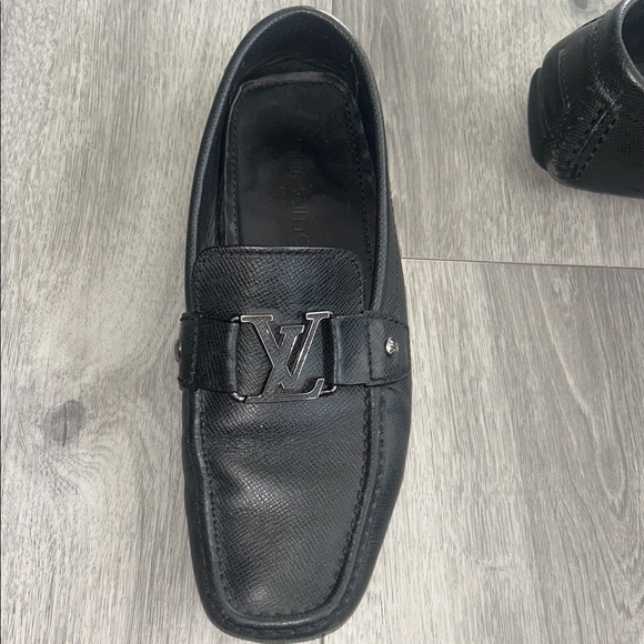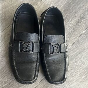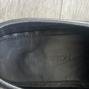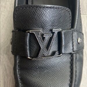 Sophisticated black leather loafers. Features iconic silver LV logo. Perfect for any occasion.