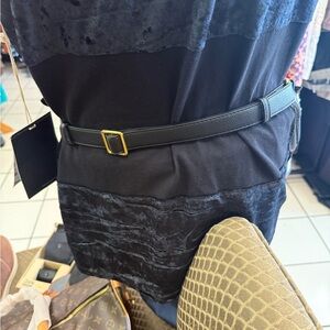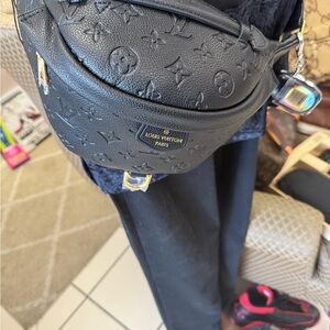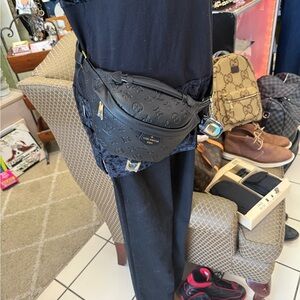 Elegant black belt bag with iconic monogram pattern. Ideal for stylish convenience.