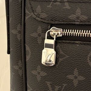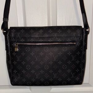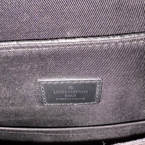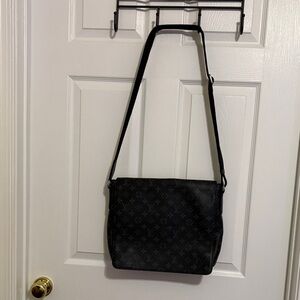 Sleek black messenger bag with iconic monogram pattern. Adjustable strap. Perfect for everyday use.