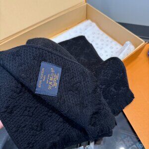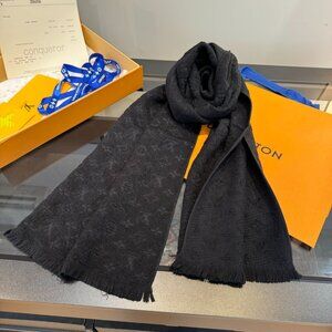 Embrace understated luxury with this authentic Louis Vuitton black monogram scarf. Crafted from premium wool, it features the iconic LV monogram pattern in a sleek all-black design, complemented by subtle fringed edges. This piece comes complete with its original orange LV box, paperwork, and branding elements, ensuring its authenticity. Whether you’re looking to add a touch of sophistication to a formal look or elevate a casual outfit, this scarf is a timeless essential. Invest in this chic, versatile piece and let its Parisian elegance redefine your cold-weather style today!