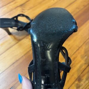 Experience the perfect blend of elegance and comfort with these Louis Vuitton black sandals. Featuring a chic slip-on mule design with an open toe and a stylish ruched strap, these sandals are ideal for both casual and semi-formal occasions. The subtle heel adds a touch of sophistication to your ensemble.