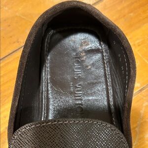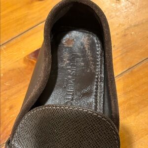 Sophisticated black loafers with textured finish. Signature LV logo on strap. Perfect for any occasion.