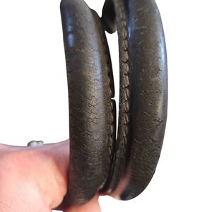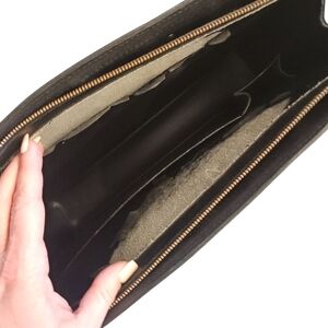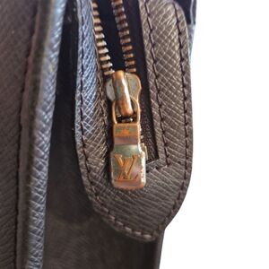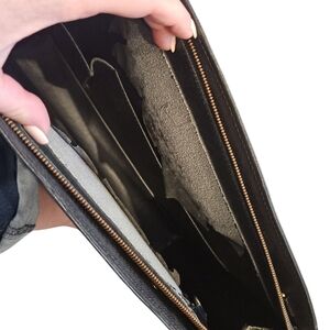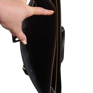 Callouts: the zipper closure compartment has a lot of peeling, otherwise clean inside. The other compartment had no peeling. Handles and corners have rubbing. Hardware shows signs of use. Minor scratches on the leather.