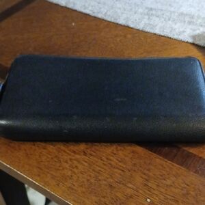 Authentic Louis Vuitton black leather wallet. Zipper closure. Compact and stylish. This wallet is simple but cute. It is made of black leather and has the V for Vuitton as the zipper pull. It has multiple compartments including credit card slots on both sides of the inside. It also has a zipper pocket on the inside that has two other compartments on each side. It looks great on both the inside and outside. It does have some normal wear on it. It is 7.5 inches wide and 4.25 inches long. If you have any questions please let me know