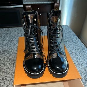 Stylish Louis Vuitton ankle boots. Features black leather and brown monogram design. Lace-up front with sturdy sole.