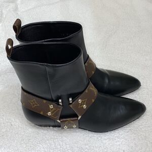Elegant black ankle boots with brown monogram strap. Sleek design with pointed toe. Perfect for stylish outings.