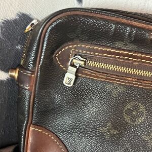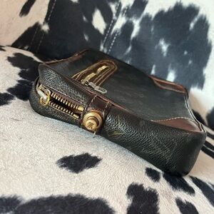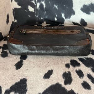 Louis Vuitton clutch. Features black and brown leather. Iconic monogram design. Missing wristlet strap and end tab. Condition is rough as shown. Zipper is torn. Inside zipper zips. Interior leather with rubs and intact with stamped LV signature label. This also has some cracks in the canvas and I think she tried to touch it up a little bit. Selling as is. Project peice. Please see all pictures