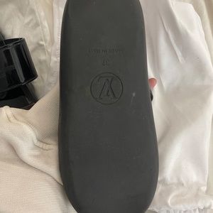 Stylish Louis Vuitton sandals. Black glossy strap with buckle. Brown monogrammed band. Perfect for casual wear.