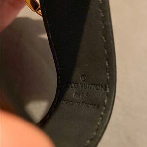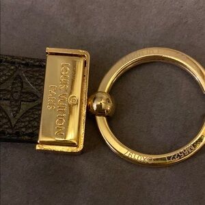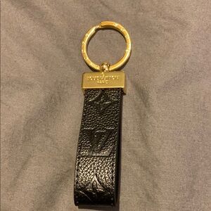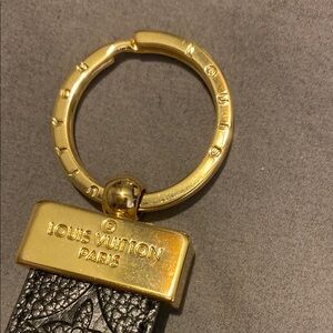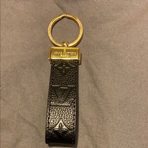 Elegant Louis Vuitton key holder. Features black leather strap. Gold-tone hardware with engraved logo.