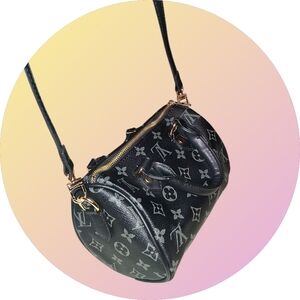 Chic Louis Vuitton satchel with iconic monogram. Stylish black and gray design. Ideal for any occasion.