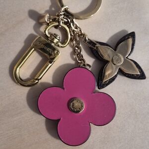 The Blooming Flowers bag charm and key holder is inspired by the classic Monogram Flowers print. Its complementary mix of materials is a nod to the expertise of Louis Vuitton's trunk-making heritage. The three individual charms are crafted from Monogram coated canvas, Epi leather and metal. It can be secured to a bag or keys thanks to its dual-function clasp.