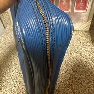 Experience the epitome of sophistication with the Louis Vuitton Blue Leather Briefcase. Crafted from high-quality leather, this briefcase boasts a structured, rectangular shape that exudes professionalism. Its rich blue hue and classic design make it an ideal choice for business or formal settings, ensuring you carry your essentials in style. Has rubbing on the outside and the inside the pocket it’s a little sticky couldn’t find the code thinking because of the storage of the bag that caused the stickynes