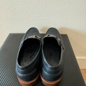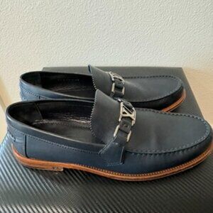 Elegant black leather loafers. Features signature LV metal detail. Comfortable slip-on design.
