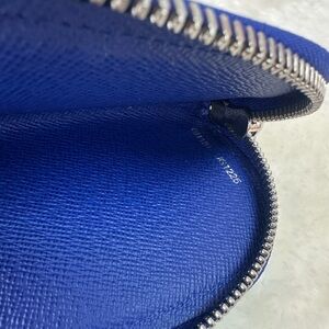 Elegant Louis Vuitton pouch in vibrant blue. Features iconic monogram pattern.
