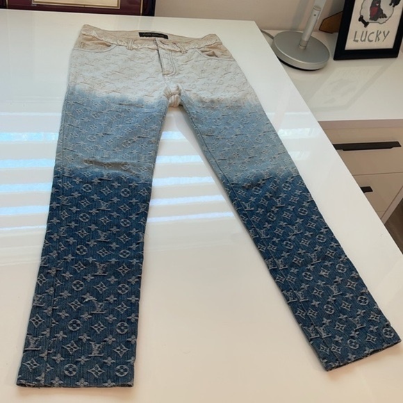 Stylish Louis Vuitton jeans. Gradient blue to white design. Iconic monogram pattern.