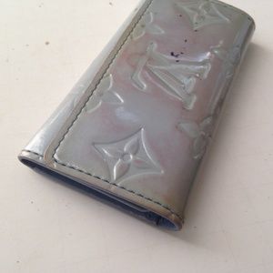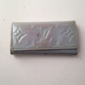 This is a beautiful 4 hooks key case made of vernis mono in purplish blue color. This key cas has a slot for folded bills, ID or Credit card. Folded it measures about 4.25 inches long and 2.5 inches wide. It has edge wear, soiling, staining and discoloration as shown in photos. Date code: CA0023-Made in Spain February 2003.